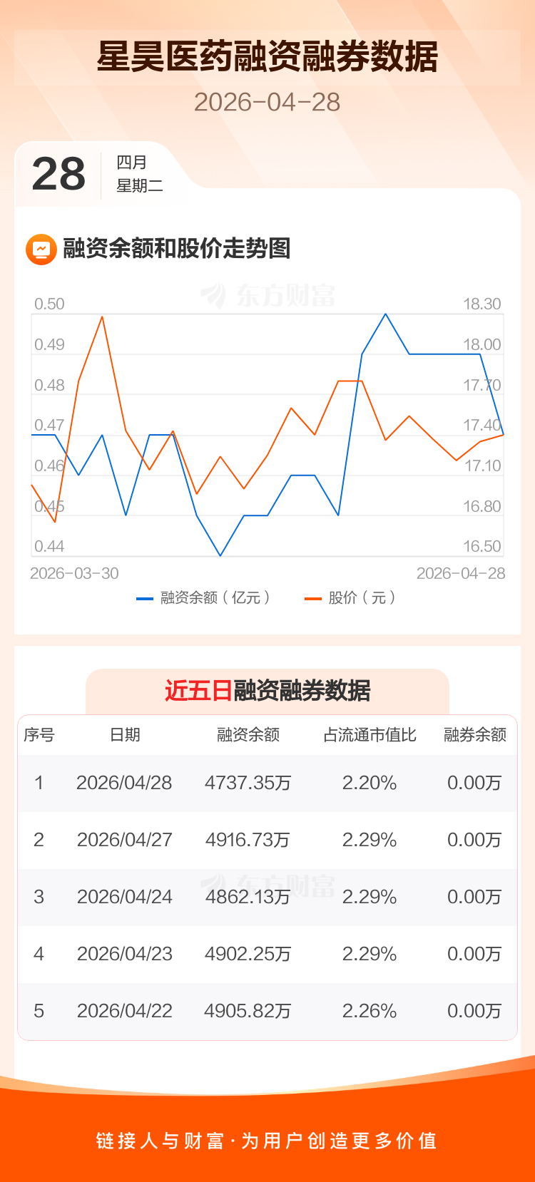 交易所最新数据显示,星昊医药于2026年4月28日获融资买入148.65万元,融资偿还328.03万元,当日融资净偿还179.37万元。目前,该股融资余额4737.36万,占流通市值比例为2.20%。