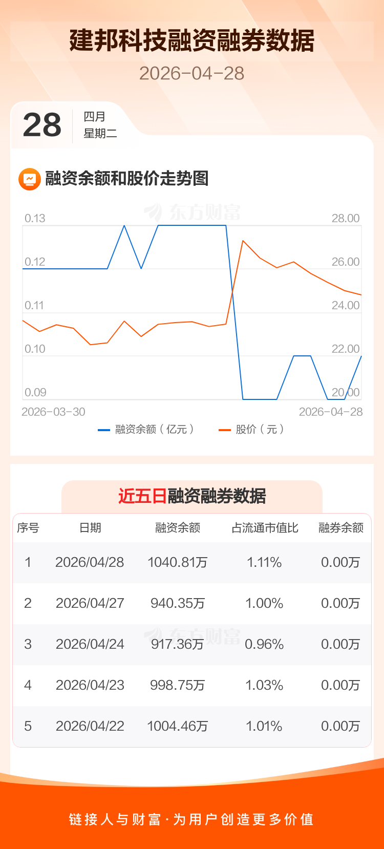 交易所最新数据显示,建邦科技于2026年4月28日获融资买入110.51万元,融资偿还10.05万元,当日融资净买入100.46万元。目前,该股融资余额1040.81万,占流通市值比例为1.11%。