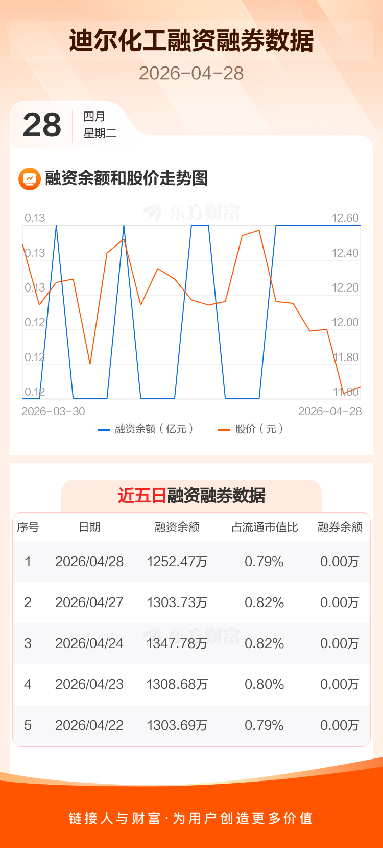 交易所最新数据显示,迪尔化工于2026年4月28日获融资买入44.79万元,融资偿还96.06万元,当日融资净偿还51.27万元。目前,该股融资余额1252.47万,占流通市值比例为0.79%。