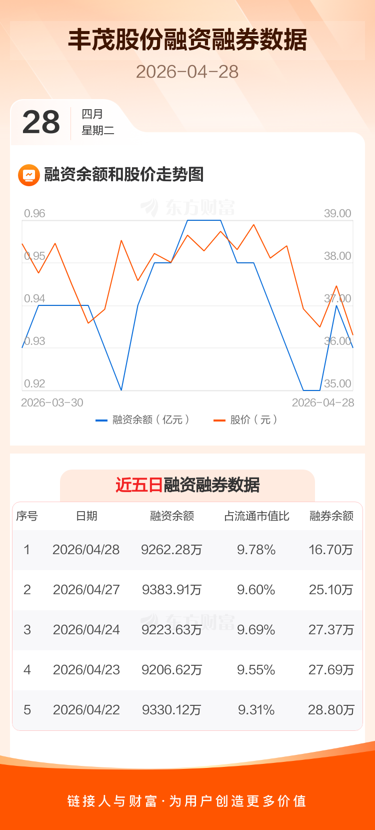 交易所最新数据显示,丰茂股份于2026年4月28日获融资买入224.39万元,融资偿还346.01万元,当日融资净偿还121.63万元。目前,该股融资余额9262.28万,占流通市值比例为9.78%。