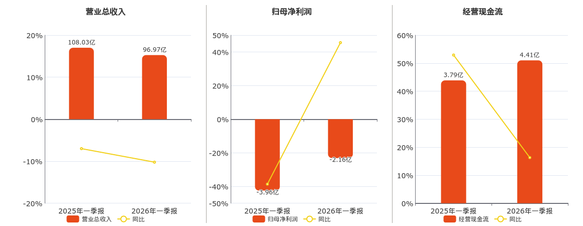 公司营业总收入为96.97亿元,在已披露的同业公司中排名第2。归母净利润为-2.16亿元,较去年同报告期归母净利润增加1.80亿元。经营活动现金净流入为4.41亿元,在已披露的同业公司中排名第7,较去年同报告期经营活动现金净流入增加6172.87万元,实现5年连续上涨,同比较去年同期上涨16.29%。