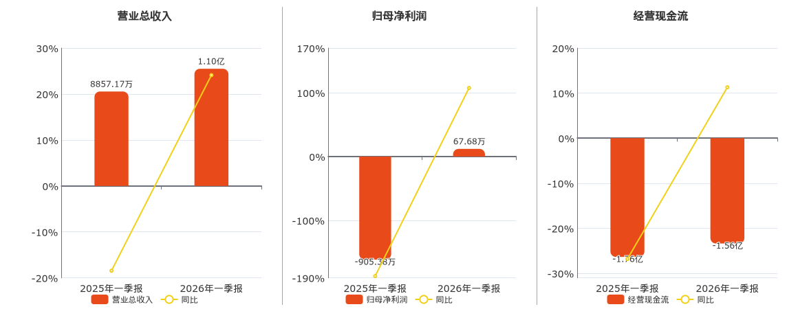 公司营业总收入为1.10亿元,较去年同报告期营业总收入增加2135.13万元,同比较去年同期上涨24.11%。归母净利润为67.68万元,较去年同报告期归母净利润增加973.06万元。经营活动现金净流入为-1.56亿元,较去年同报告期经营活动现金净流入增加1993.18万元。