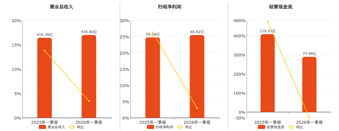 公司营业总收入为430.80亿元。归母净利润为60.82亿元。经营活动现金净流入为77.99亿元,较去年同报告期经营活动现金净流入减少32.03亿元,同比较去年同期下降29.11%。