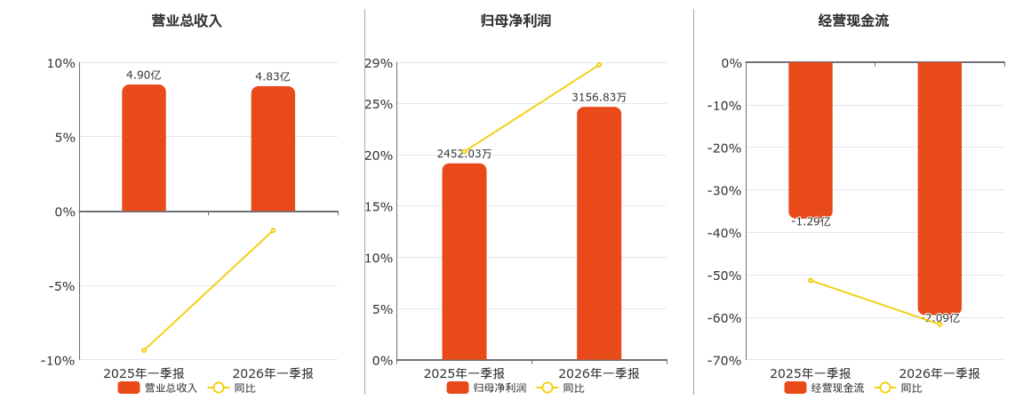公司营业总收入为4.83亿元,较去年同报告期营业总收入减少640.36万元,同比较去年同期下降1.31%。归母净利润为3156.83万元。经营活动现金净流入为-2.09亿元,在已披露的同业公司中排名第82,较去年同报告期经营活动现金净流入减少7973.71万元。