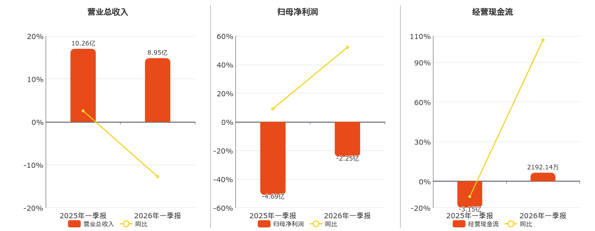 公司营业总收入为8.95亿元,在已披露的同业公司中排名第5。归母净利润为-2.25亿元,较去年同报告期归母净利润增加2.44亿元,实现2年连续上涨。经营活动现金净流入为2192.14万元,较去年同报告期经营活动现金净流入增加3.37亿元。