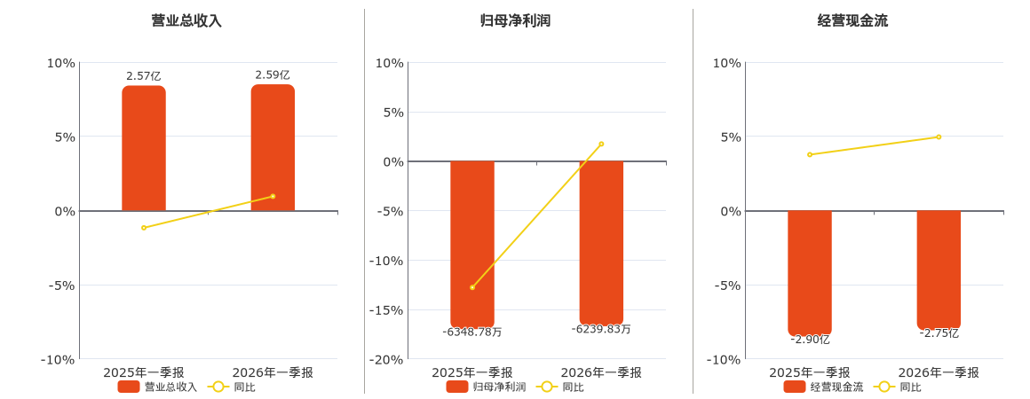 公司营业总收入为2.59亿元。归母净利润为-6239.83万元,在已披露的同业公司中排名第97。经营活动现金净流入为-2.75亿元,在已披露的同业公司中排名第99。