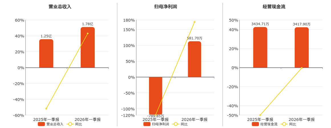 公司营业总收入为1.78亿元。归母净利润为581.70万元。经营活动现金净流入为3417.90万元,较去年同报告期经营活动现金净流入减少16.82万元,同比较去年同期下降0.49%。