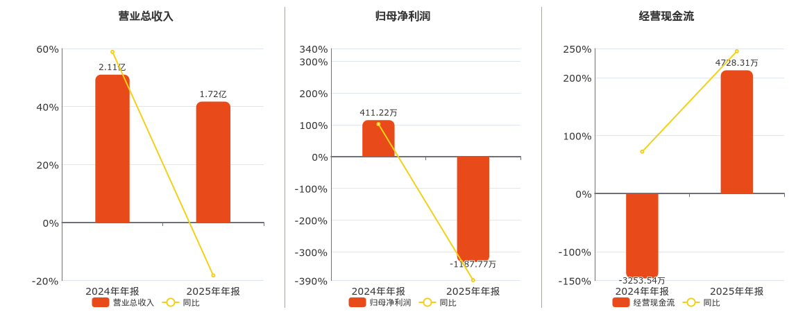 公司营业总收入为1.72亿元,在已披露的同业公司中排名第80,较去年同报告期营业总收入减少3845.11万元,同比较去年同期下降18.24%。归母净利润为-1187.77万元,在已披露的同业公司中排名第63,较去年同报告期归母净利润减少1598.99万元,同比较去年同期下降388.84%。经营活动现金净流入为4728.31万元,在已披露的同业公司中排名第52,较去年同报告期经营活动现金净流入增加7981.85万元,实现2年连续上涨。