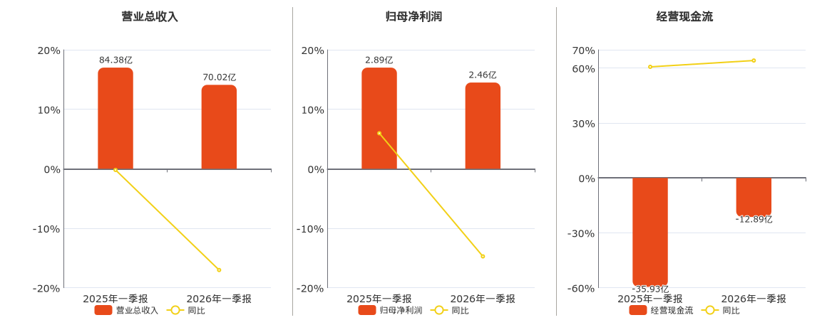 公司营业总收入为70.02亿元,在已披露的同业公司中排名第2,较去年同报告期营业总收入减少14.36亿元,同比较去年同期下降17.02%。归母净利润为2.46亿元,在已披露的同业公司中排名第2,较去年同报告期归母净利润减少4252.83万元,同比较去年同期下降14.73%。经营活动现金净流入为-12.89亿元,在已披露的同业公司中排名第40,较去年同报告期经营活动现金净流入增加23.04亿元,实现2年连续上涨。