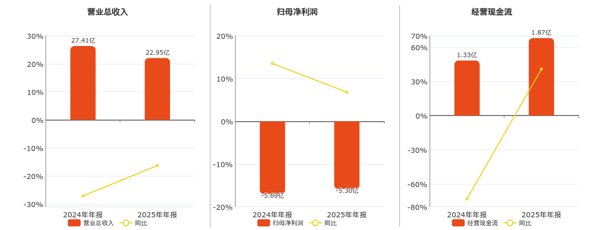 公司营业总收入为22.95亿元,较去年同报告期营业总收入减少4.46亿元,同比较去年同期下降16.26%。归母净利润为-5.30亿元,在已披露的同业公司中排名第66。经营活动现金净流入为1.87亿元。