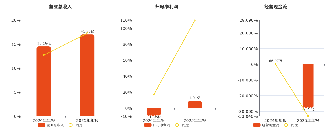 公司营业总收入为41.25亿元,在已披露的同业公司中排名第17,较去年同报告期营业总收入增加6.07亿元,实现2年连续上涨,同比较去年同期上涨17.25%。归母净利润为1.04亿元,在已披露的同业公司中排名第27,较去年同报告期归母净利润增加11.98亿元,实现2年连续上涨。经营活动现金净流入为-2.21亿元。