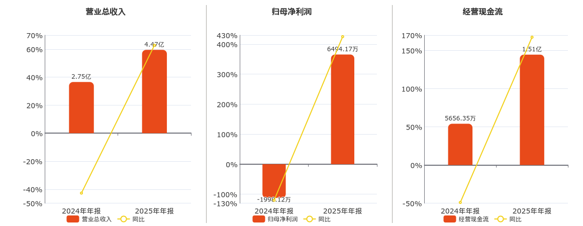 公司营业总收入为4.47亿元,在已披露的同业公司中排名第68。归母净利润为6494.17万元。经营活动现金净流入为1.51亿元。