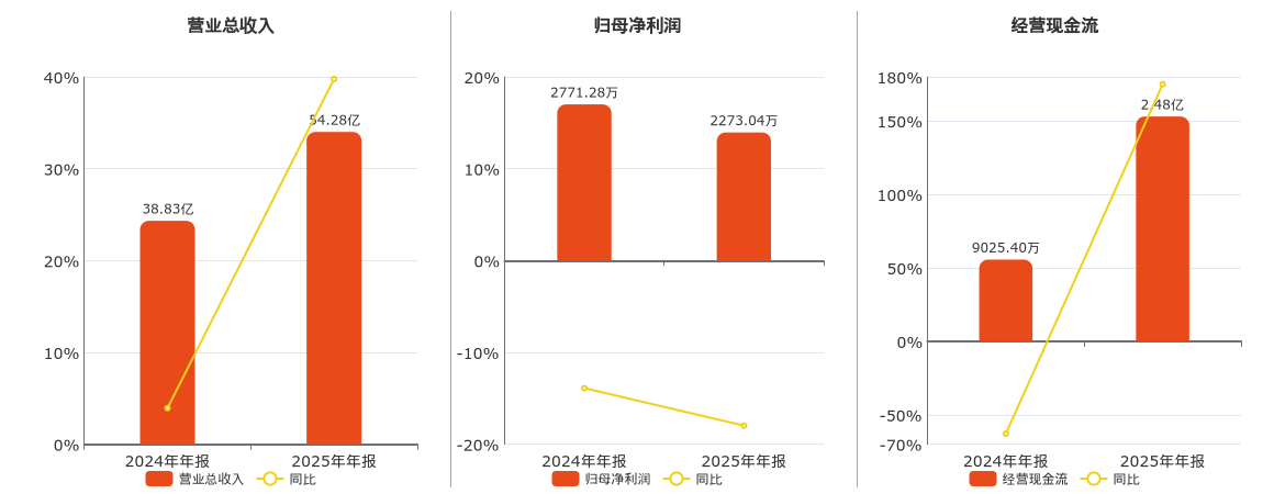 公司营业总收入为54.28亿元,在已披露的同业公司中排名第9,较去年同报告期营业总收入增加15.44亿元,实现5年连续上涨,同比较去年同期上涨39.77%。归母净利润为2273.04万元,在已披露的同业公司中排名第22,较去年同报告期归母净利润减少498.24万元,同比较去年同期下降17.98%。经营活动现金净流入为2.48亿元,在已披露的同业公司中排名第12,较去年同报告期经营活动现金净流入增加1.58亿元,同比较去年同期上涨174.94%。