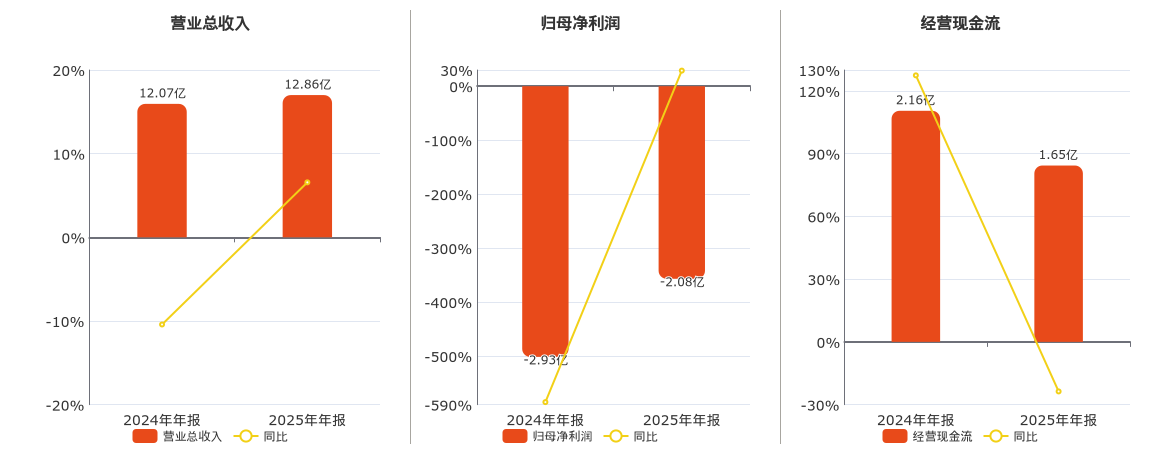 公司营业总收入为12.86亿元。归母净利润为-2.08亿元,在已披露的同业公司中排名第183。经营活动现金净流入为1.65亿元,较去年同报告期经营活动现金净流入减少5122.53万元,同比较去年同期下降23.68%。