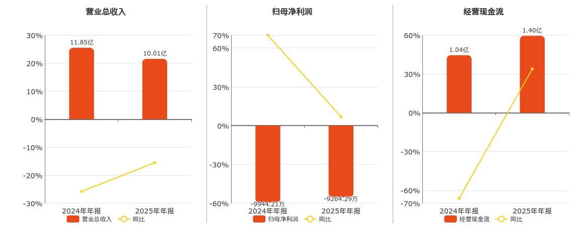 公司营业总收入为10.01亿元,较去年同报告期营业总收入减少1.84亿元,同比较去年同期下降15.53%。归母净利润为-9264.29万元,在已披露的同业公司中排名第43。经营活动现金净流入为1.40亿元。