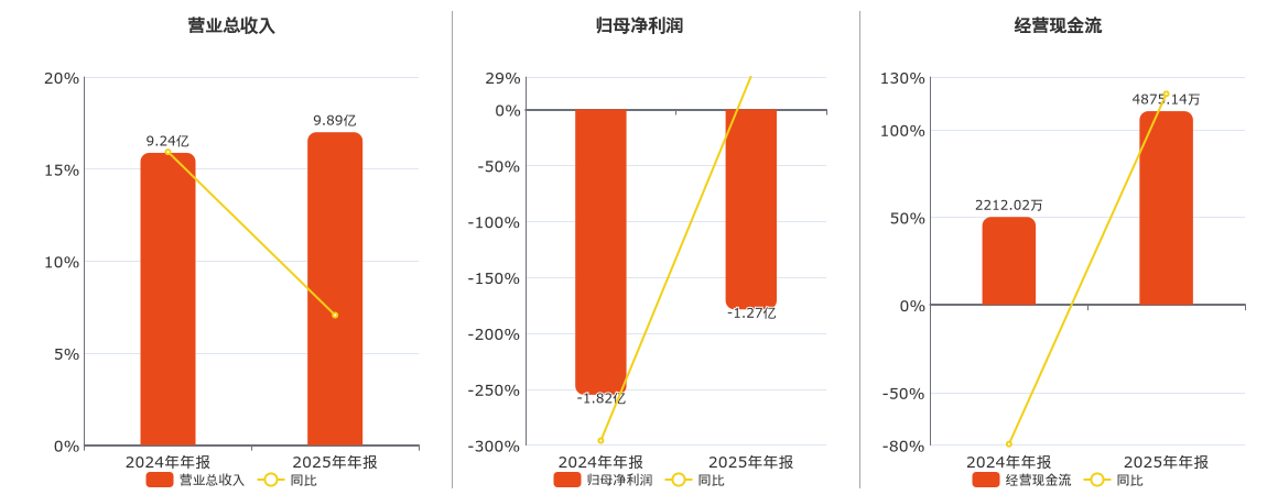 公司营业总收入为9.89亿元,在已披露的同业公司中排名第26。归母净利润为-1.27亿元,在已披露的同业公司中排名第33。经营活动现金净流入为4875.14万元,在已披露的同业公司中排名第27。