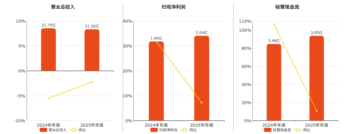 公司营业总收入为21.26亿元,较去年同报告期营业总收入减少4941.36万元,同比较去年同期下降2.27%。归母净利润为2.04亿元。经营活动现金净流入为3.85亿元。
