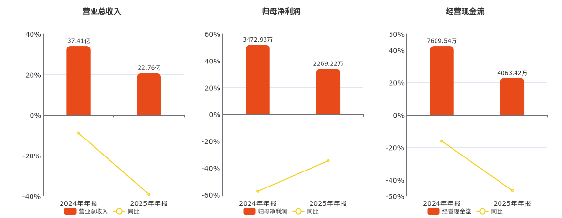 公司营业总收入为22.76亿元,在已披露的同业公司中排名第25,较去年同报告期营业总收入减少14.65亿元,同比较去年同期下降39.17%。归母净利润为2269.22万元,在已披露的同业公司中排名第22,较去年同报告期归母净利润减少1203.70万元,同比较去年同期下降34.66%。经营活动现金净流入为4063.42万元,在已披露的同业公司中排名第24,较去年同报告期经营活动现金净流入减少3546.12万元,同比较去年同期下降46.60%。