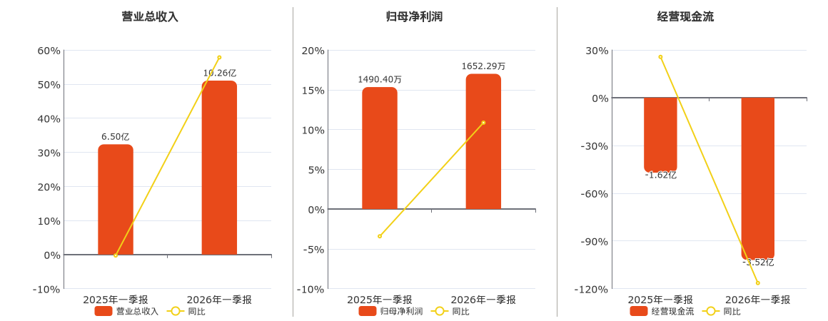 公司营业总收入为10.26亿元。归母净利润为1652.29万元,在已披露的同业公司中排名第58。经营活动现金净流入为-3.52亿元,在已披露的同业公司中排名第92,较去年同报告期经营活动现金净流入减少1.89亿元。