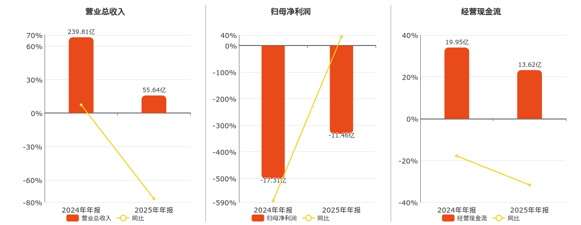 公司营业总收入为55.64亿元,较去年同报告期营业总收入减少184.17亿元,同比较去年同期下降76.80%。归母净利润为-11.46亿元,在已披露的同业公司中排名第60。经营活动现金净流入为13.62亿元,较去年同报告期经营活动现金净流入减少6.33亿元,同比较去年同期下降31.73%。