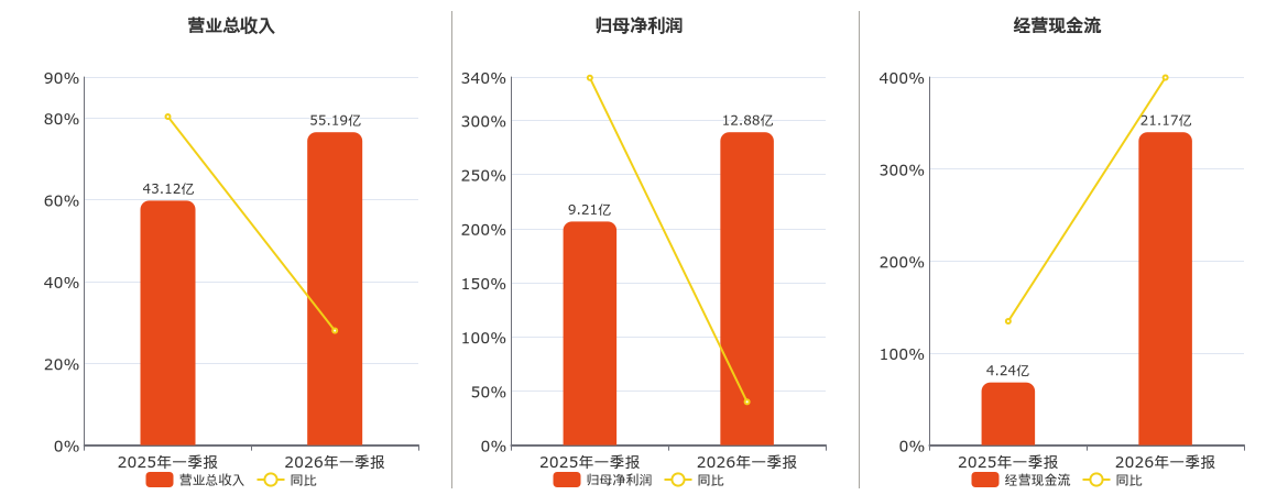 公司营业总收入为55.19亿元。归母净利润为12.88亿元。经营活动现金净流入为21.17亿元。