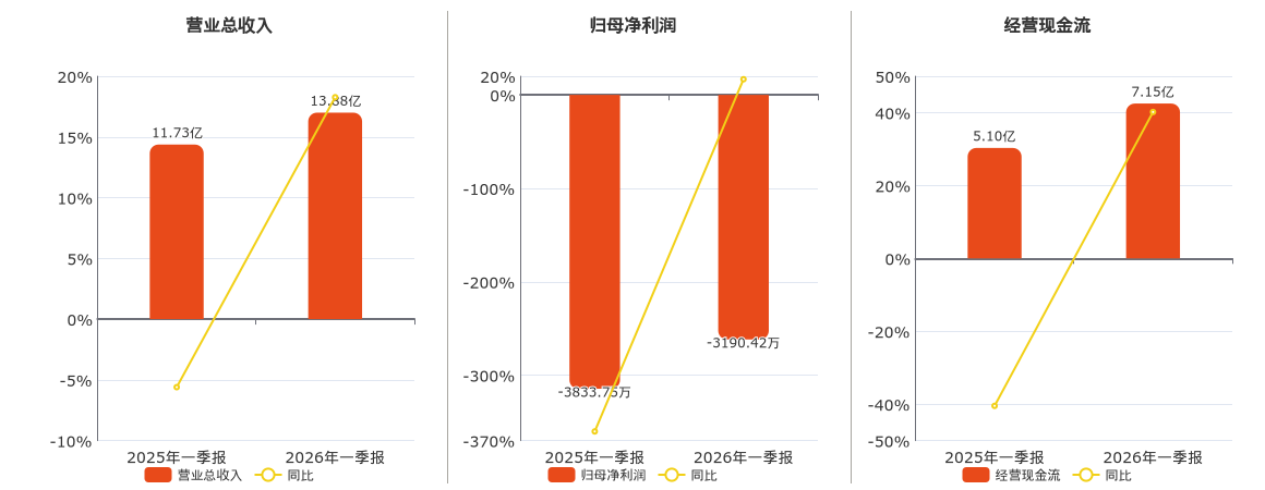 公司营业总收入为13.88亿元。归母净利润为-3190.42万元,在已披露的同业公司中排名第33。经营活动现金净流入为7.15亿元。