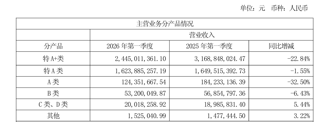 分档次来看,2026年一季度,今世缘特A+类、特A类、A类、B类产品营收同比分别减少22.84%、1.55%、32.50%、6.43%,C类、D类及其他产品营收则同比实现增长。