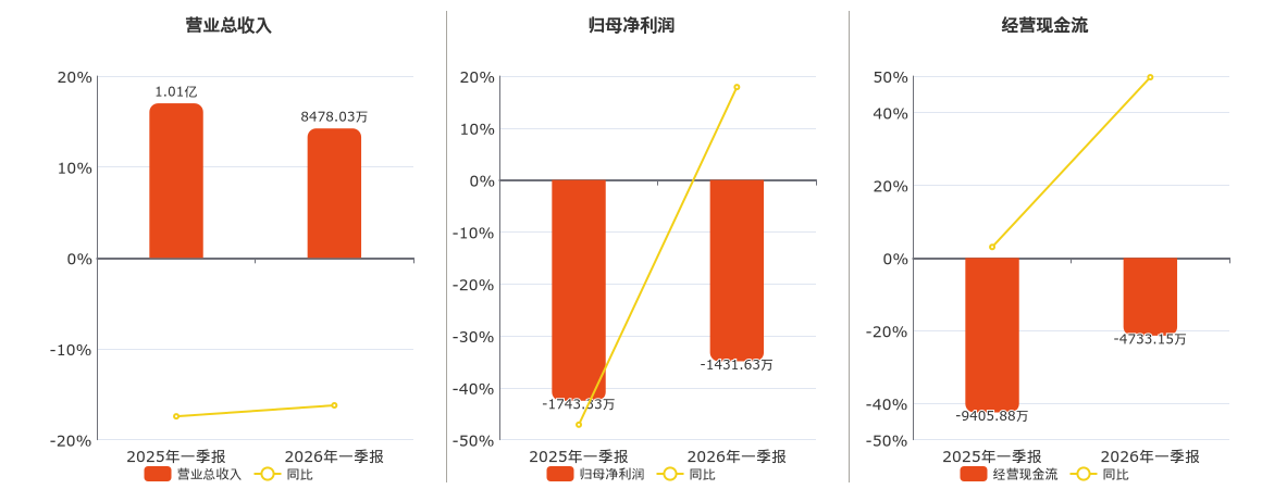 公司营业总收入为8478.03万元,在已披露的同业公司中排名第74,较去年同报告期营业总收入减少1641.89万元,同比较去年同期下降16.22%。归母净利润为-1431.63万元,在已披露的同业公司中排名第66。经营活动现金净流入为-4733.15万元。