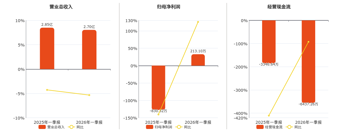 公司营业总收入为2.70亿元,在已披露的同业公司中排名第46,较去年同报告期营业总收入减少1523.76万元,同比较去年同期下降5.34%。归母净利润为213.10万元,在已披露的同业公司中排名第63。经营活动现金净流入为-6437.26万元,在已披露的同业公司中排名第78,较去年同报告期经营活动现金净流入减少3061.22万元。