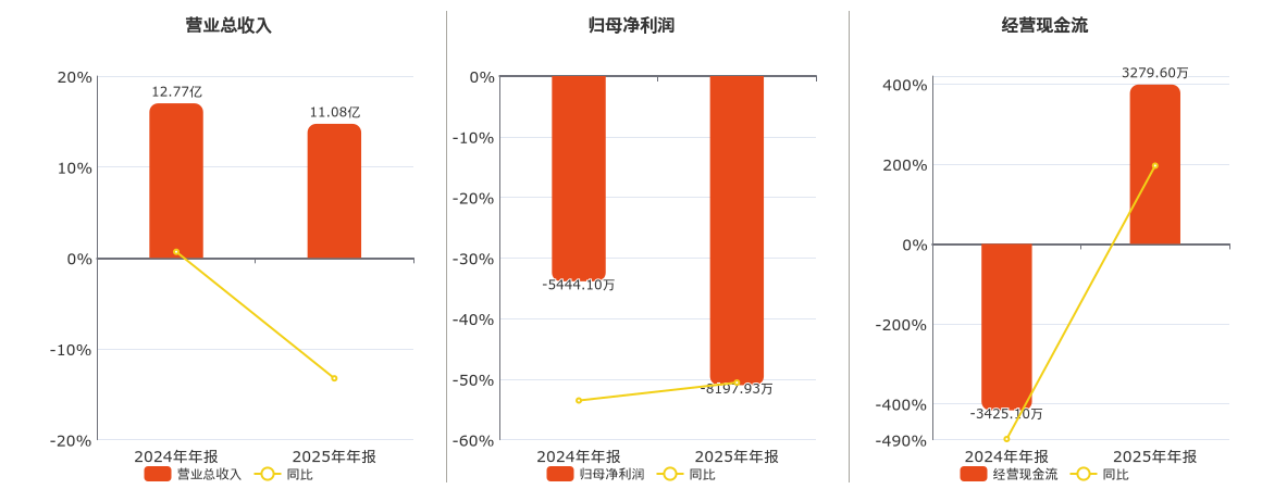 公司营业总收入为11.08亿元,在已披露的同业公司中排名第23,较去年同报告期营业总收入减少458.52万元,同比较去年同期下降0.41%。归母净利润为-8197.93万元,在已披露的同业公司中排名第30,较去年同报告期归母净利润减少2409.18万元。经营活动现金净流入为3279.60万元,在已披露的同业公司中排名第33。