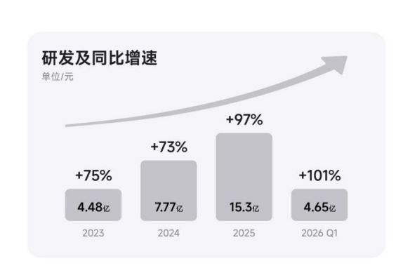 实际上,高强度的研发投入是影石创新利润承压的直接原因。2025年影石创新研发投入达到15.3亿元,同比近乎翻倍;2026年一季度研发投入达4.65亿元,同比涨幅达101%。除投入原有主营业务外,公司还战略投入研发两款无人机(含已上市的全球首款全景无人机“影翎A1”)、云台相机、无线领夹麦克风及其他三个新品类,并同步定制开发三款芯片。