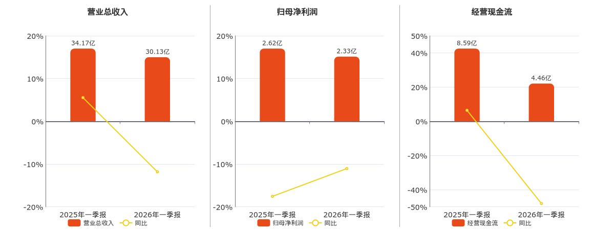 公司营业总收入为30.13亿元,在已披露的同业公司中排名第5,较去年同报告期营业总收入减少4.36亿元,同比较去年同期下降12.64%。归母净利润为2.33亿元,在已披露的同业公司中排名第12,较去年同报告期归母净利润减少3311.21万元,同比较去年同期下降12.44%。经营活动现金净流入为4.46亿元,在已披露的同业公司中排名第9,较去年同报告期经营活动现金净流入减少4.17亿元,同比较去年同期下降48.30%。