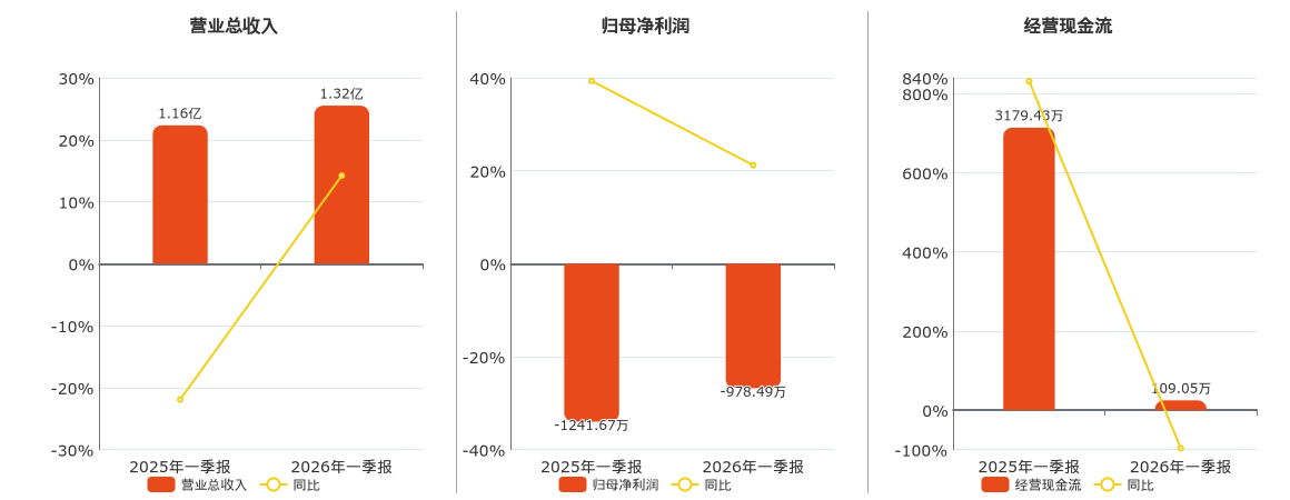 公司营业总收入为1.32亿元,在已披露的同业公司中排名第103。归母净利润为-978.49万元,在已披露的同业公司中排名第115。经营活动现金净流入为109.05万元,在已披露的同业公司中排名第87,较去年同报告期经营活动现金净流入减少3070.38万元,同比较去年同期下降96.57%。