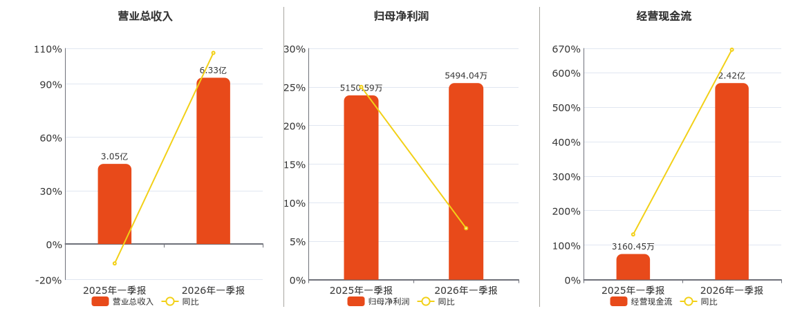 公司营业总收入为6.33亿元。归母净利润为5494.04万元。经营活动现金净流入为2.42亿元。