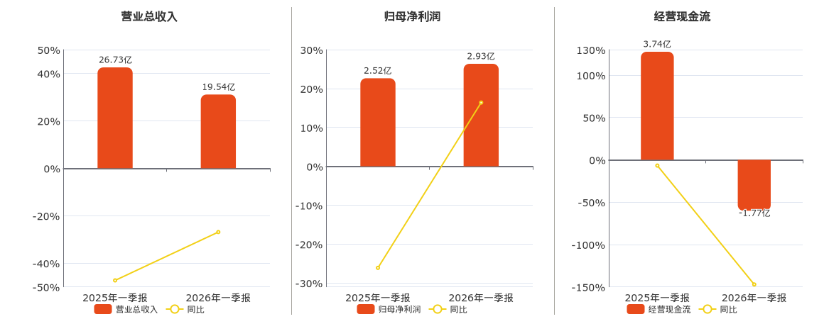 公司营业总收入为19.54亿元,较去年同报告期营业总收入减少7.19亿元,同比较去年同期下降26.90%。归母净利润为2.93亿元。经营活动现金净流入为-1.77亿元,在已披露的同业公司中排名第8,较去年同报告期经营活动现金净流入减少5.51亿元,同比较去年同期下降147.19%。