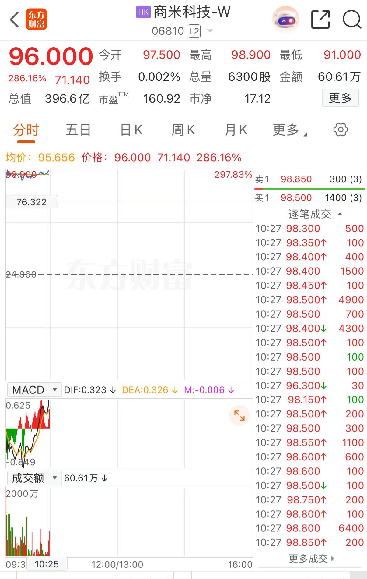 上证报中国证券网讯(记者孔令仪)4月29日,商米科技-W正式登陆港交所,早盘一度触及98.9港元/股,较发行价24.86港元/股涨超297%。截至10时25分,商米科技-W报96港元/股,涨286.16%。
