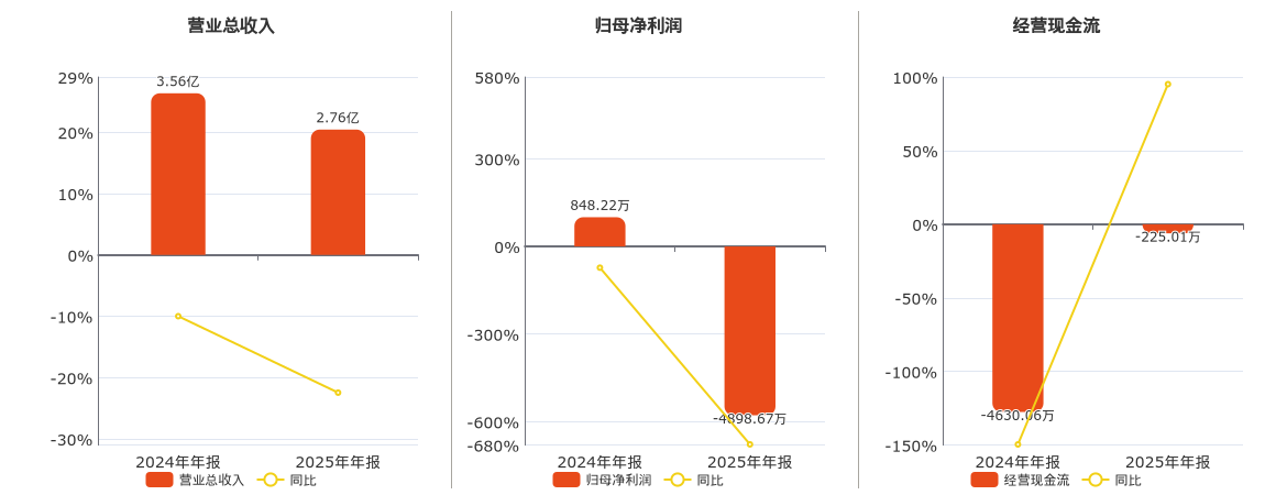公司营业总收入为2.76亿元,在已披露的同业公司中排名第109,较去年同报告期营业总收入减少7998.61万元,同比较去年同期下降22.45%。归母净利润为-4898.67万元,在已披露的同业公司中排名第85,较去年同报告期归母净利润减少5746.89万元,同比较去年同期下降677.52%。经营活动现金净流入为-225.01万元,在已披露的同业公司中排名第92。