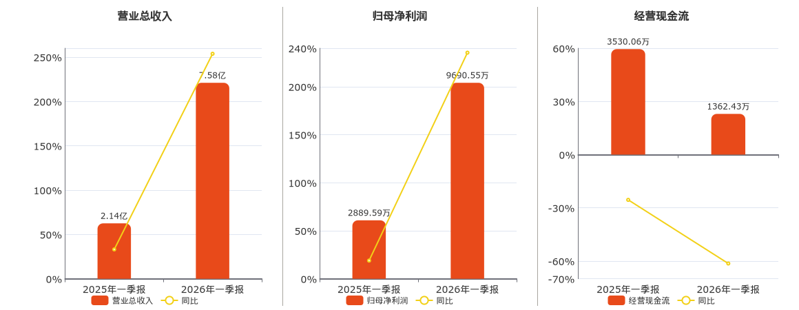 公司营业总收入为7.58亿元。归母净利润为9690.55万元。经营活动现金净流入为1362.43万元。