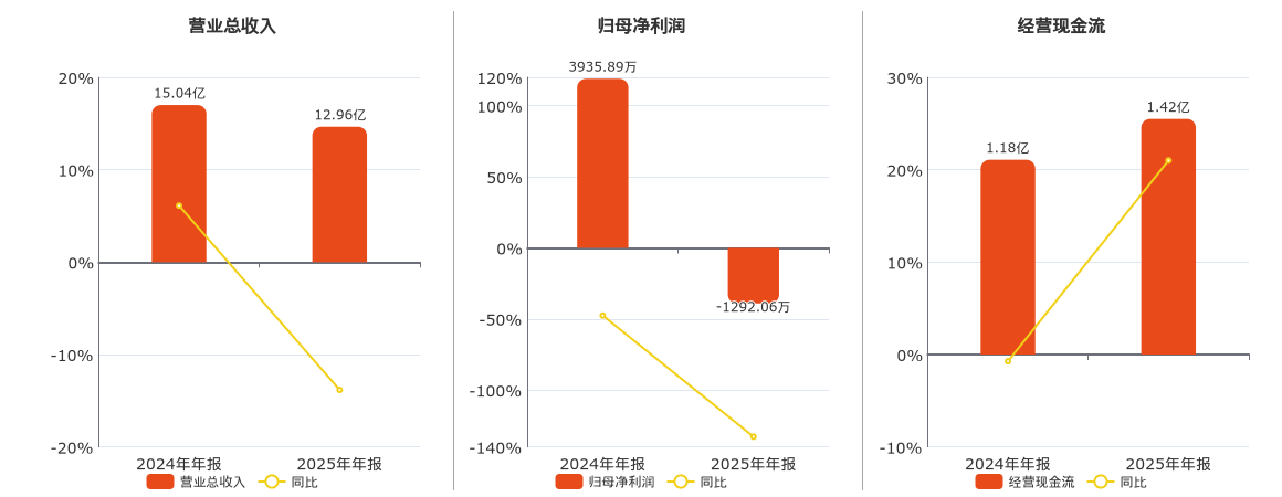 公司营业总收入为12.96亿元,在已披露的同业公司中排名第98,较去年同报告期营业总收入减少2.08亿元,同比较去年同期下降13.83%。归母净利润为-1292.06万元,在已披露的同业公司中排名第143,较去年同报告期归母净利润减少5227.95万元,同比较去年同期下降132.83%。经营活动现金净流入为1.42亿元。