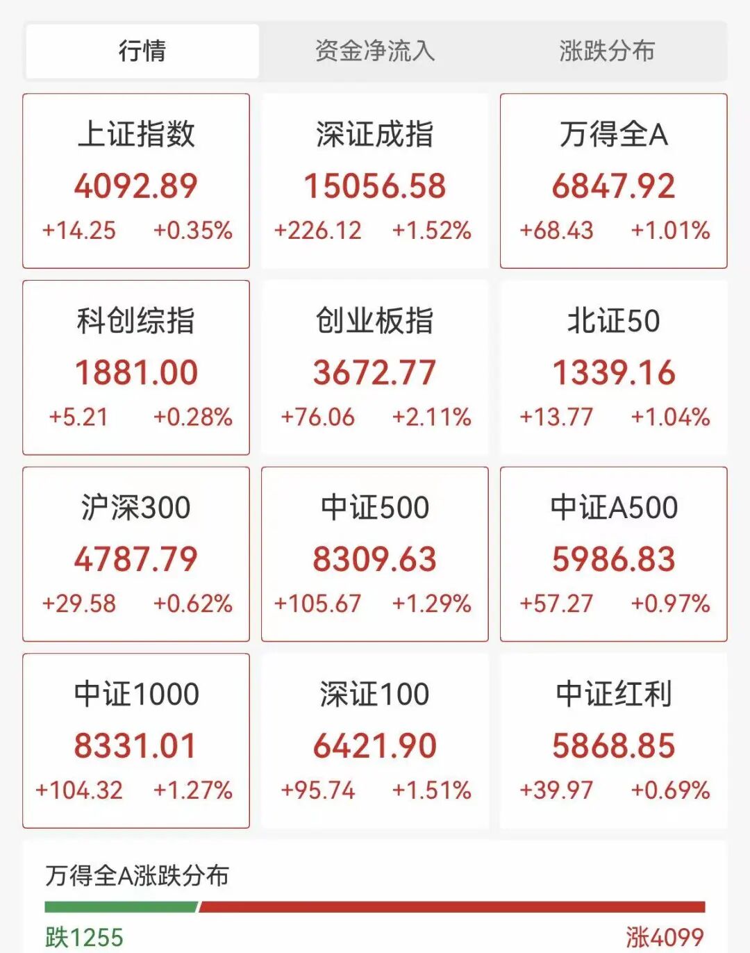 截至发稿,指数走强,创业板指涨幅扩大至2%,沪指涨0.35%,深证成指涨超1%,科创综指涨0.28%。全市场超4000只个股上涨。