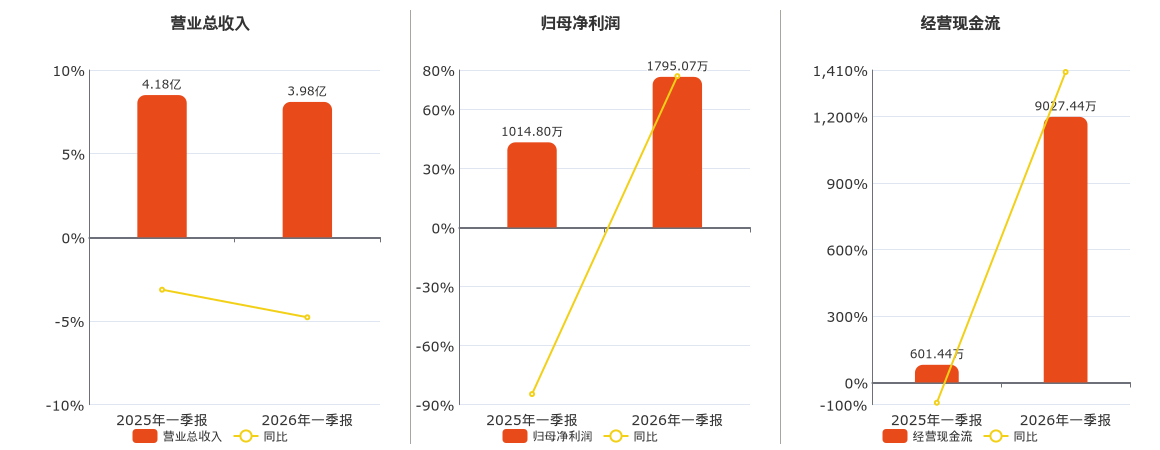 公司营业总收入为3.98亿元,较去年同报告期营业总收入减少1998.72万元,同比较去年同期下降4.78%。归母净利润为1795.07万元,在已披露的同业公司中排名第58。经营活动现金净流入为9027.44万元。