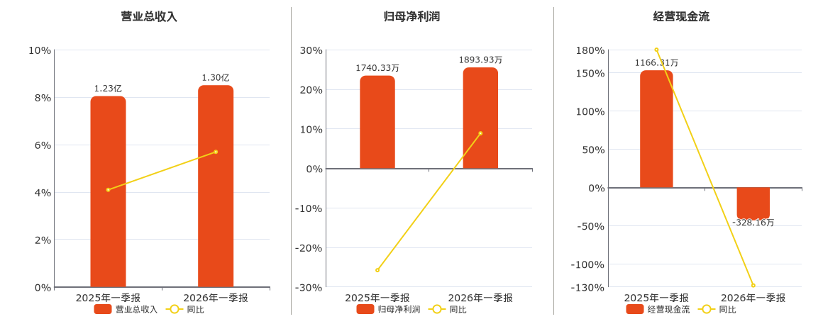 公司营业总收入为1.30亿元,在已披露的同业公司中排名第134。归母净利润为1893.93万元。经营活动现金净流入为-328.16万元,较去年同报告期经营活动现金净流入减少1494.48万元,同比较去年同期下降128.14%。