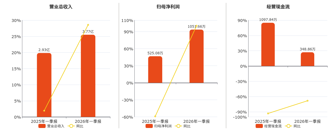 公司营业总收入为3.77亿元。归母净利润为1051.66万元。经营活动现金净流入为348.86万元,较去年同报告期经营活动现金净流入减少748.98万元,同比较去年同期下降68.22%。