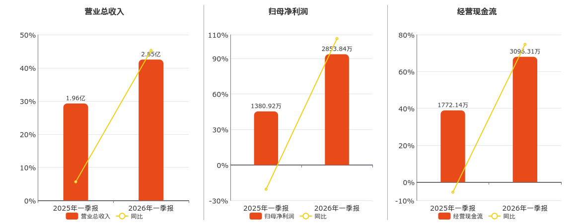 公司营业总收入为2.85亿元,在已披露的同业公司中排名第60。归母净利润为2853.84万元。经营活动现金净流入为3096.31万元。