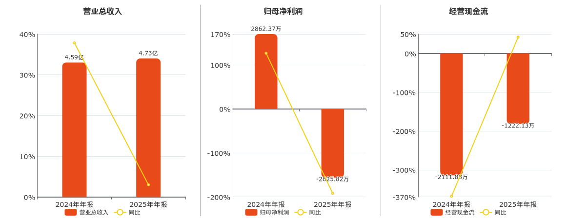 公司营业总收入为4.73亿元,在已披露的同业公司中排名第32。归母净利润为-2625.82万元,在已披露的同业公司中排名第35,较去年同报告期归母净利润减少5488.19万元,同比较去年同期下降191.74%。经营活动现金净流入为-1222.13万元,在已披露的同业公司中排名第43。