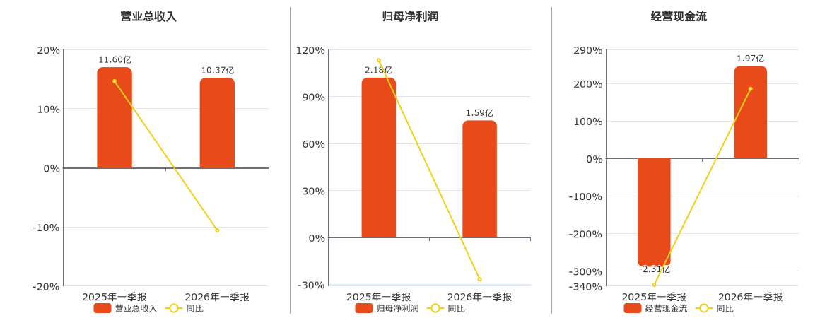 公司营业总收入为10.37亿元,在已披露的同业公司中排名第28,较去年同报告期营业总收入减少1.23亿元,同比较去年同期下降10.58%。归母净利润为1.59亿元,在已披露的同业公司中排名第23,较去年同报告期归母净利润减少5821.88万元,同比较去年同期下降26.76%。经营活动现金净流入为1.97亿元,在已披露的同业公司中排名第14,较去年同报告期经营活动现金净流入增加4.28亿元。