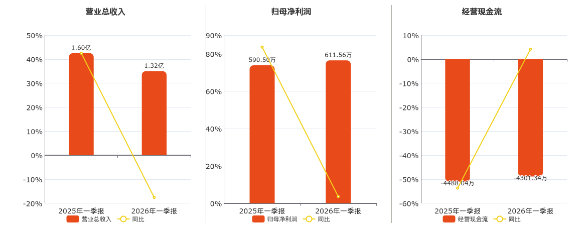 公司营业总收入为1.32亿元,在已披露的同业公司中排名第10,较去年同报告期营业总收入减少2824.43万元,同比较去年同期下降17.61%。归母净利润为611.56万元,在已披露的同业公司中排名第9。经营活动现金净流入为-4301.34万元。