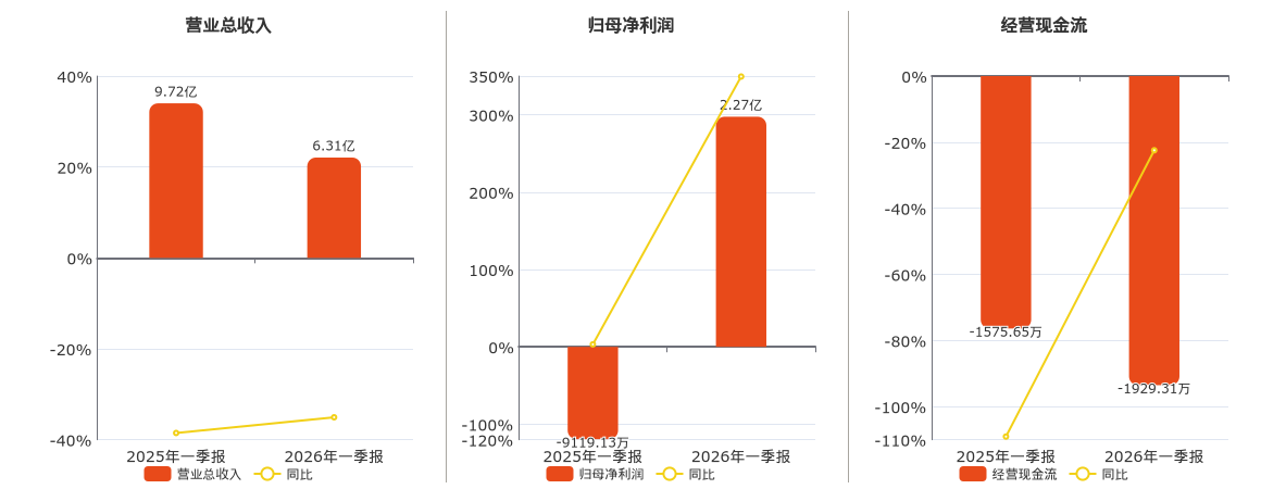 公司营业总收入为6.31亿元,在已披露的同业公司中排名第12,较去年同报告期营业总收入减少3.41亿元,同比较去年同期下降35.07%。归母净利润为2.27亿元。经营活动现金净流入为-1929.31万元,在已披露的同业公司中排名第12,较去年同报告期经营活动现金净流入减少353.66万元。