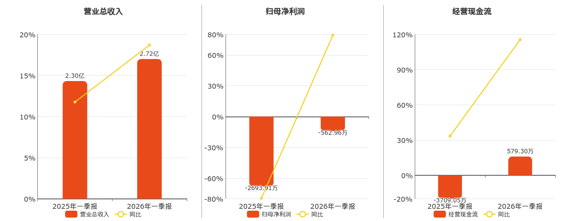 公司营业总收入为2.72亿元。归母净利润为-562.96万元,在已披露的同业公司中排名第55。经营活动现金净流入为579.30万元。