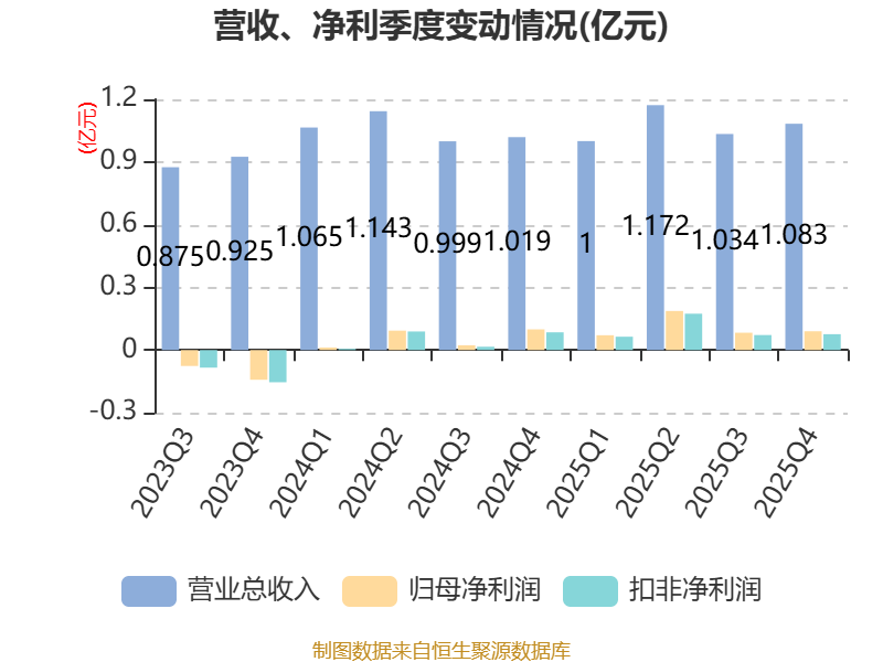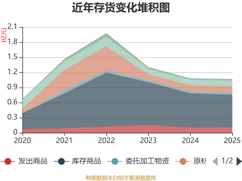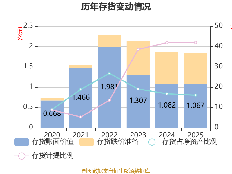 从存货变动来看,截至2025年末,公司存货账面价值为1.07亿元,占净资产的15.98%,较上年末减少152.61万元。其中,存货跌价准备为7699.39万元,计提比例为41.92%。